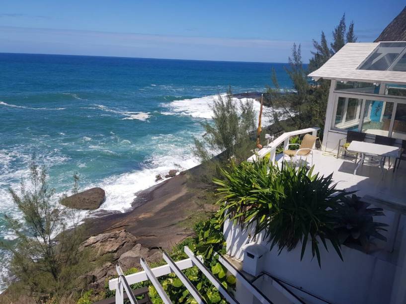 A casa: No topo de uma grande pedra, a ladeira para chegar até a residência pode assustar, principalmente quem tiver carro com motor 1.0. Tem quem encare, mas há aqueles que preferem estacionar na praia e subir a pé. Seja qual a for a maneira, a recompensa é uma vista do mar de causar suspiros. A casa, que recebe até seis hóspedes, tem piscina, jardim, churrasqueira e decoração inspirada na Grécia. Reserve aqui.